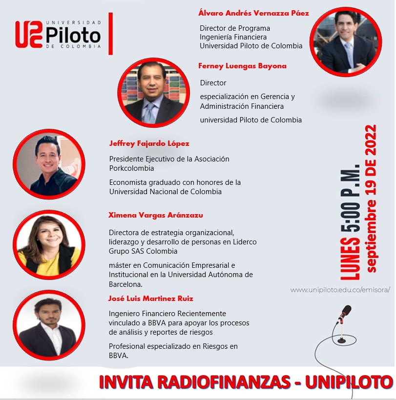 ¡Te esperamos! https://www.unipiloto.edu.co/emisora/ No se pierdan la programación de hoy, contaremos con especialistas en finanzas, riesgos  y asuntos públicos.
