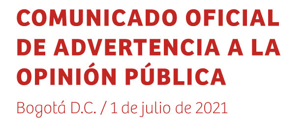 1. En el día de hoy, primero de julio de 2021, nos hemos enterado que en Bogotá D.C., de forma fraudulenta personas inescrupulosas están tratando de engañar al público en general a través de una publicidad falsa, en la cual indebidamente utilizan la imagen institucional y los signos distintivos de la Universidad, para avalar una supuesta alianza con el MINISTERIO DE TRABAJO y con la empresa METRO DE BOGOTÁ S.A., -convenio que es inexistente-, para ofrecer unos pretendidos contratos de trabajo a quienes previamente adelanten un hipotético diplomado bajo la modalidad virtual, para lo cual previamente deben pagar el valor de la matrícula a una cuenta de ahorros de BANCOLOMBIA, de la cual la Universidad no es su titular ni ha autorizado a dicha entidad financiera recaudo alguno.
