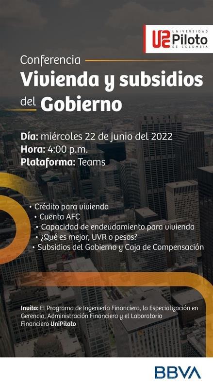 El programa de Ingeniería Financiera, la Especialización en Gerencia y Administración Financiera y el Laboratorio Financiero Unipiloto invita a toda la comunidad académica a participar a la conferencia: vivienda y subsidios del Gobierno.