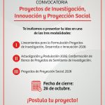 Como es habitual, la Dirección de Investigación, Innovación y Proyección Social presenta anualmente la convocatoria de investigación, ahora integrando a la formativa y la de proyectos de proyección social. Esto con el fin de conformar el banco de proyectos para investigación generativa, semilleros y proyección social que orientará el trabajo en el año 2025. Por lo tanto, adjuntamos la convocatoria, la cual se divide en las siguientes modalidades:
