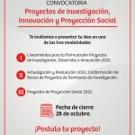 Como es habitual, la Dirección de Investigación, Innovación y Proyección Social presenta anualmente la convocatoria de investigación, ahora integrando a la formativa y la de proyectos de proyección social. Esto con el fin de conformar el banco de proyectos para investigación generativa, semilleros y proyección social que orientará el trabajo en el año 2026. Por lo tanto, adjuntamos la convocatoria, la cual se divide en las siguientes modalidades: