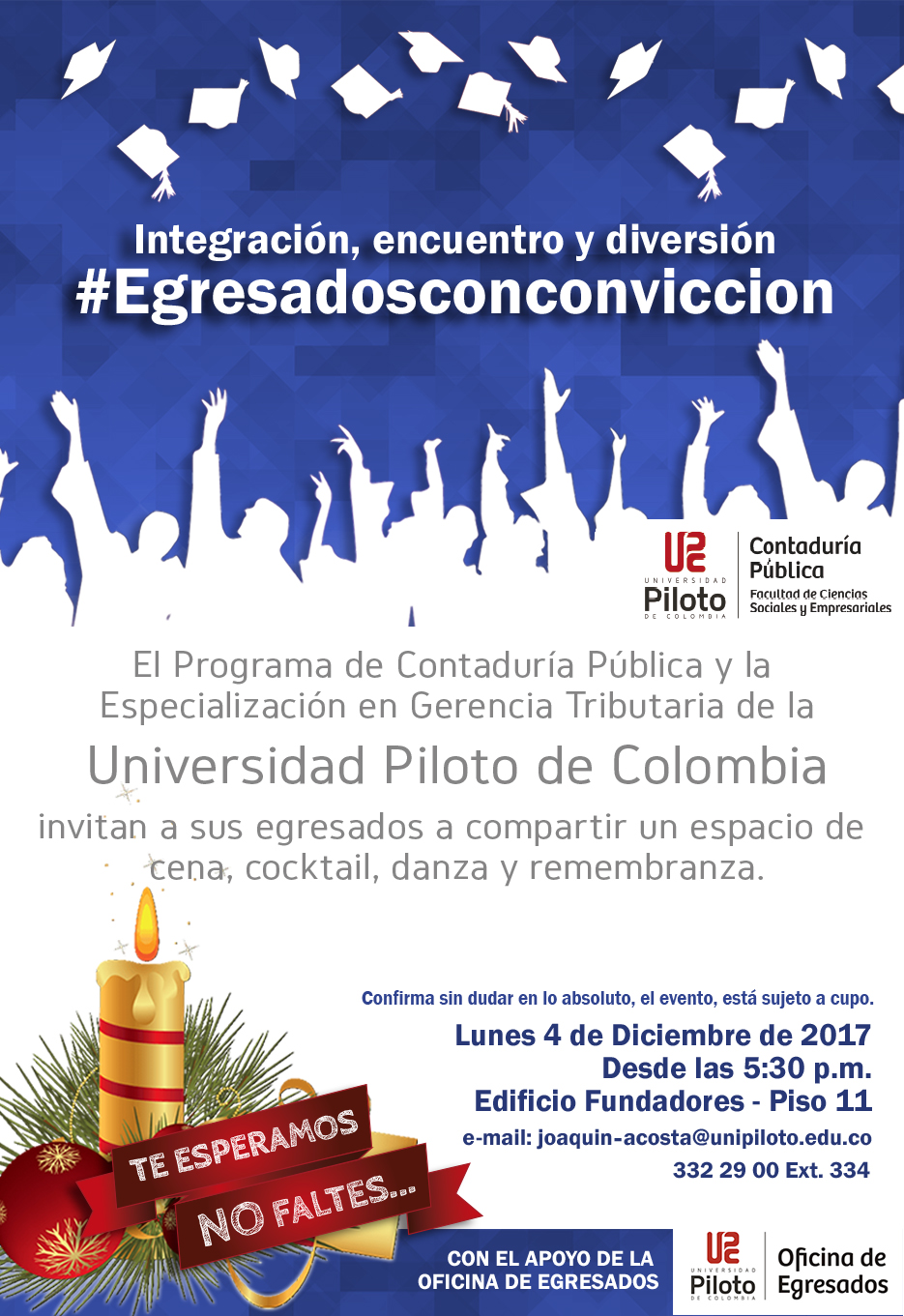 El pasado 4 de Diciembre de 2017 el Programa de Contaduría Pública y la Especialización en Gerencia Tributaria, llevaron a cabo el encuentro de Egresados, donde el principal lema de participación fue la Convicción de ser egresado Piloto.