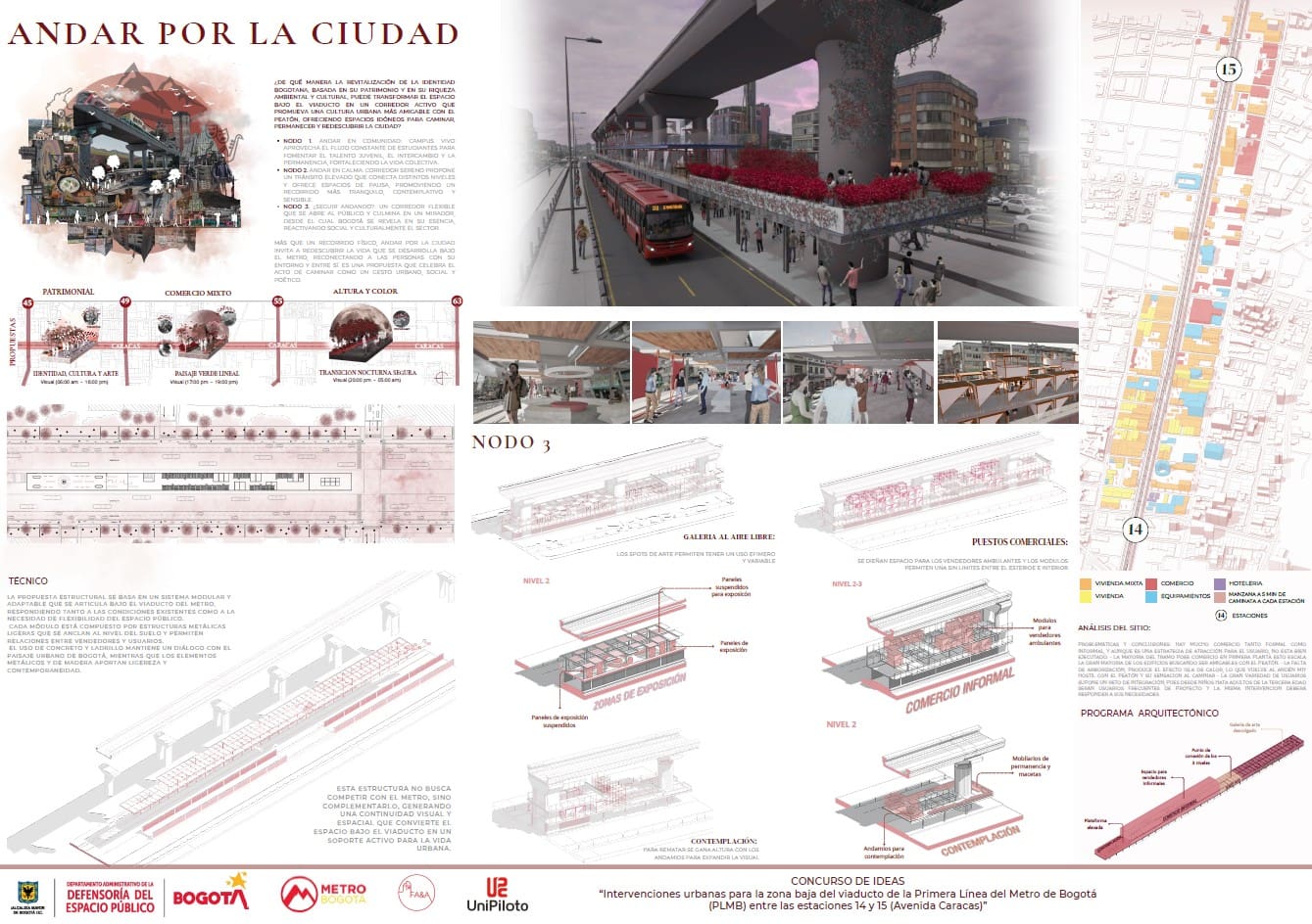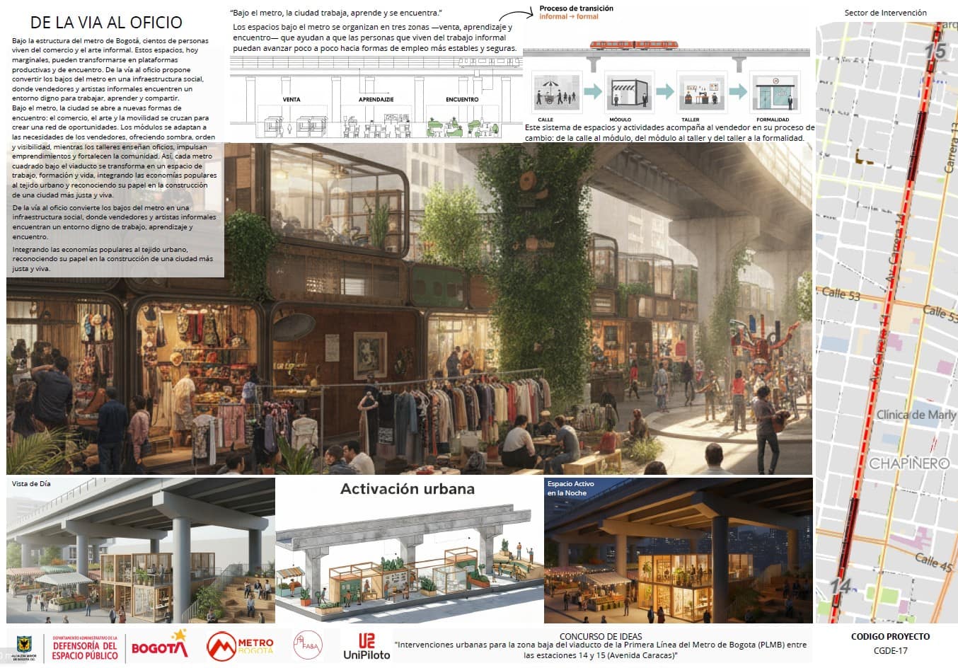 El proyecto De la vía al oficio transforma los espacios bajo el metro de Bogotá en una infraestructura social donde el comercio y el arte informal se integran al tejido urbano. Propone áreas de trabajo, talleres y zonas de encuentro que brindan dignidad y oportunidades a vendedores y artistas informales. .
