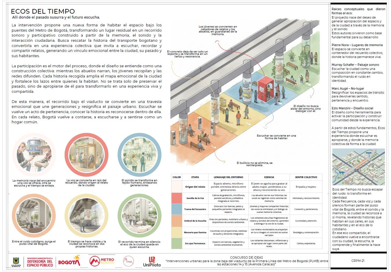 La intervención propone una nueva forma de habitar el espacio bajo los puentes del Metro de Bogotá, transformando un lugar residual en un recorrido sonoro y participativo construido a partir de la memoria, el sonido y la interacción ciudadana. Busca rescatar la historia del transporte bogotano y convertirla en una experiencia colectiva que invita a escuchar, recordar y compartir relatos, generando un vínculo emocional entre la ciudad, su pasado y sus habitantes.