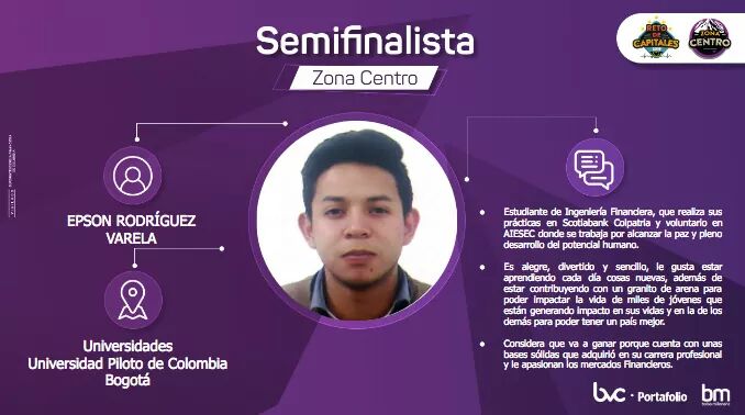El Programa de Ingeniería Financiera se hizo presente en el concurso con la participación de docentes y estudiantes de pregrado y colegios. El estudiante Epson Farley Rodriguez obtuvo el mejor desempeño en la fase eliminatoria, llegando a la final regional donde ocupó el tercer puesto.