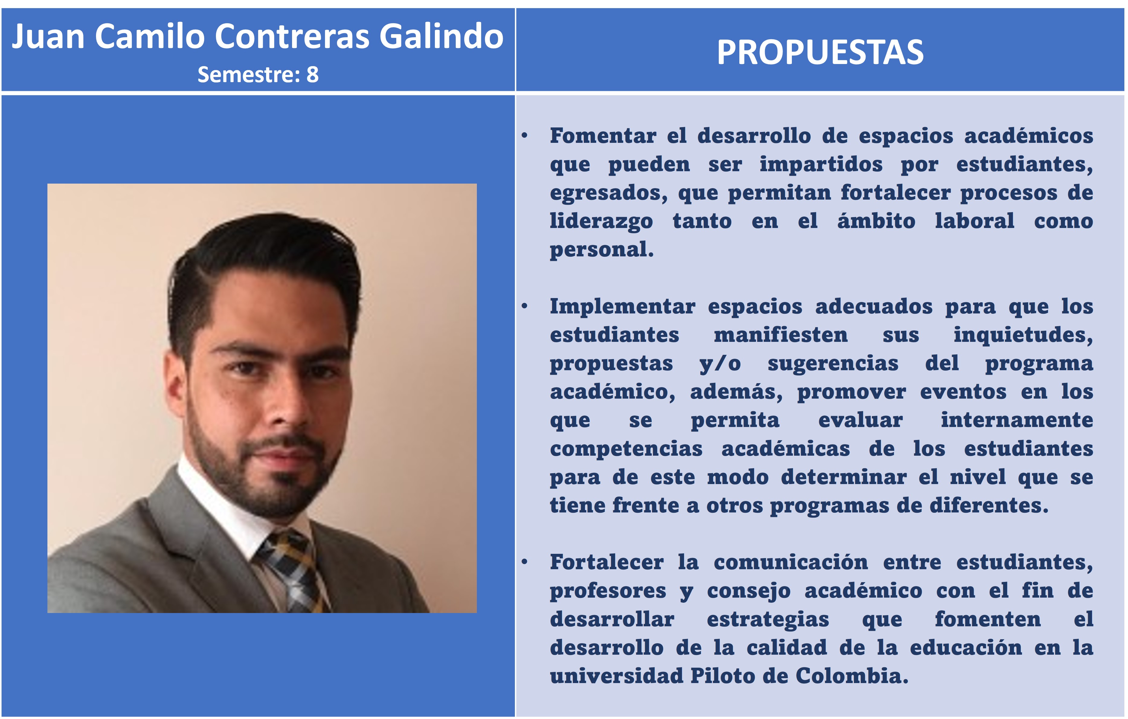 Como Representante de los estudiantes el ganador fue Juan Camilo Contreras Galindo quien obtuvo el mayor número de votos y Paula Daniela Castellanos Pinzón su suplente quien ocupó el segundo lugar, de acuerdo con el acta de escrutinio realizado el día 26 de abril de 2022 en presencia del doctor Álvaro Andrés Vernazza Páez – Director del Programa, doctora Jeannette Rodríguez Coordinadora académica y el profesor Edgar Leonardo Rodríguez Solórzano.