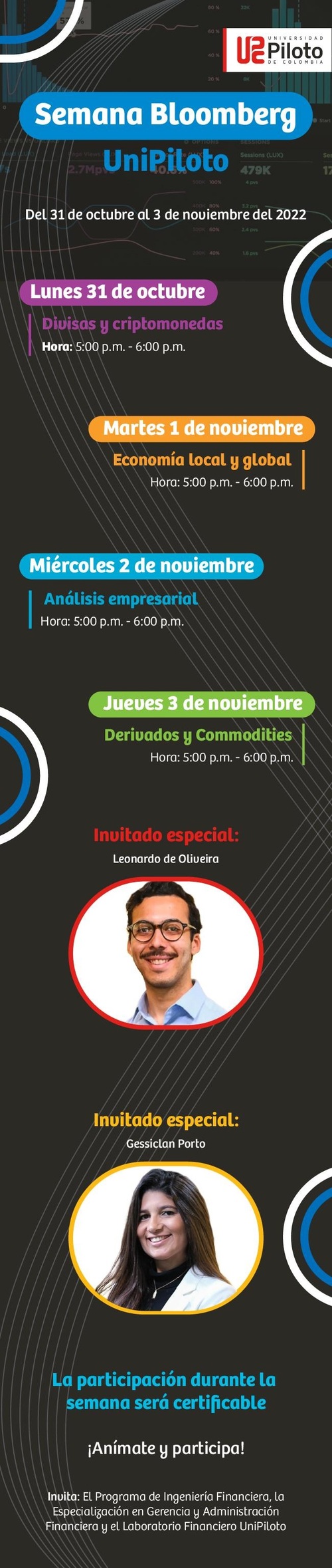 ¡No te pierdas de las conferencias y cursos que brindara el Laboratorio Financiero Unipiloto con el apoyo del Programa de Ingeniería Financiera y la Especialización en Gerencia y Administración Financiera , participa, inscríbete ya! 📊📈📉