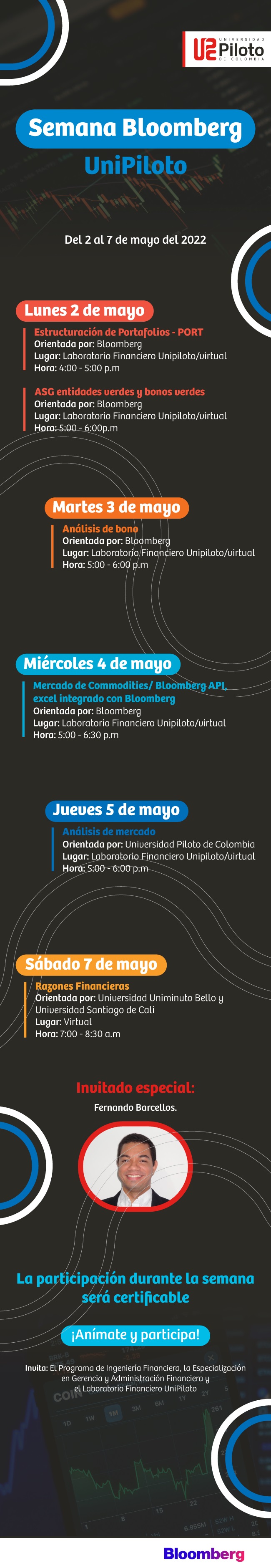 El Programa de Ingeniería Financiera, la Especialización en Gerencia y Administración Financiera y el Laboratorio Financiero Unipiloto invita a toda la comunidad académica a participar en la semana Bloomberg.
