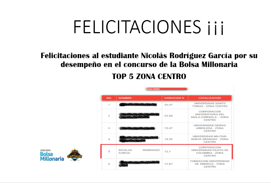 0 0 Felicitamos al estudiante Nicolas Rodriguez Garcia por su desempeño en #ConcursoBolsaMillonaria #Top5 TOP 5 BOLSA MILLONARIA2018-04-112020-09-16https://www.unipiloto.edu.co/wp-content/uploads/2025/04/log-upc-alta-calidad-min-min.jpgUniversidad Piloto de Colombiahttps://www.unipiloto.edu.co/wp-content/uploads/2020/09/nr.png200px200pxRecent PostsAsí se vivió el XXXII Taller Internacional Interdisciplinar en MéxicoResultados de la participación en actividades de internacionalización durante 2024-2025Comunicado oficial UniPiloto Suspensión de términos de las actuaciones disciplinariasHiperpaternidad: análisis del profesor Carlos Garavito en Blu Radio